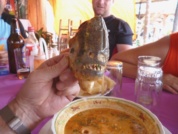 Anschließend sind wir noch an den Fluß und haben frischen Fisch gegessen. Natürlich mußte Klaus Pirañasuppe essen, hier der Kopf.